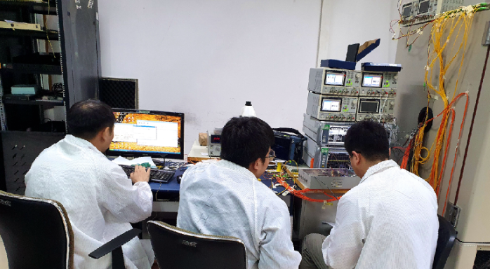 驗證與測試工作也馬不停蹄。產(chǎn)品初樣焊裝完成后,光傳輸部員工絲毫沒有歇息,立刻緊鑼密鼓地投入到了調試和改進工作中。從調試的第一天開始,相關負責人就從未離開第一線,時時刻刻都在指揮協(xié)調,甚至還與驗證與測試員工一起設置溫箱、記錄數(shù)據(jù)、測試流程、改進軟件,焊線、接線、調儀器……他們齊心協(xié)力堅守崗位,周末無休,終于,在大家的共同努力下,國產(chǎn)化光轉換組件通過一次次評審,開始為用戶供貨!